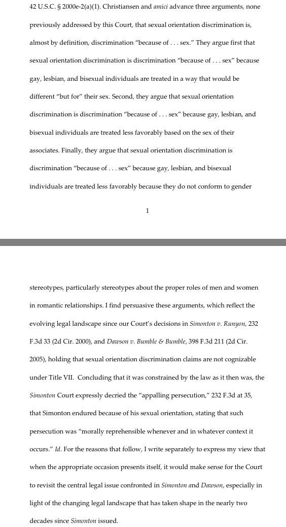 Chief Judge Katzmann writes separately to urge the full Court en banc to overrule or abrogate Simonton and recognize sexual orientation discrimination as protected under Title VII.