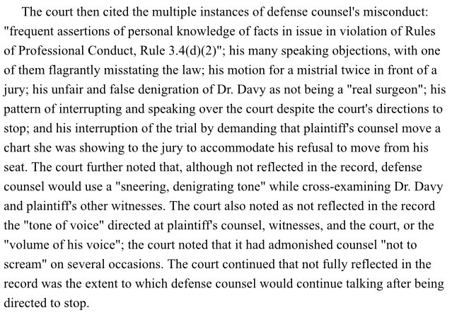 In Smith v Rudolph, the First Department affirms a trial court decision to set aside a personal injury verdict in the plaintiff’s favor because defense counsel’s conduct was so egregious that it deprived the plaintiff of fair trial. The Court held: