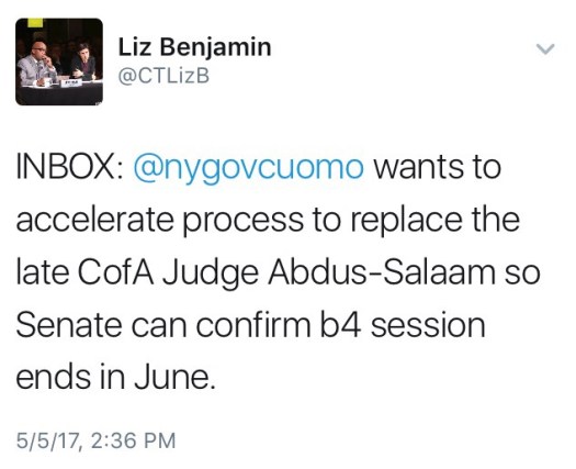 This is an interesting development in the process to appoint a new Associate Judge to the Court of Appeals to fill Judge Shelia Abdus-Salaam’s seat. Although the Governor may want a new Judge confirmed by the end of the June legislative session, it seems highly unlikely that that will be possible.
