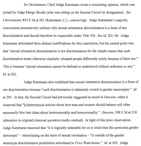 In Philpott v State of New York (SDNY Case No. 16 CIV 6778), U.S. District Court Judge Alvin K. Hellerstein decided he wouldn’t wait to see if the Second Circuit would grant en banc review in Christiansen v Omnicom Group to hold that Title VII prohibits discrimination on the basis of sexual orientation. Relying on Chief Judge Katzmann’s persuasive concurrence in Christiansen discussed here, and the Seventh Circuit’s en banc ruling in Hively v Ivy Tech Community College of Indiana, Judge Hellerstein held that he would not embrace what he called an “‘illogical’ and artificial distinction between gender stereotyping discrimination and sexual orientation discrimination.”