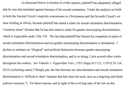 Judge Hellerstein’s decision, although surprising that he declined to follow the Second Circuit’s controlling precedent in Simonton v Runyon, is just the latest step in what will in all likelihood culminate in an en banc ruling of the Second Circuit joining the Seventh Circuit to hold that Title VII protects against sexual orientation discrimination.