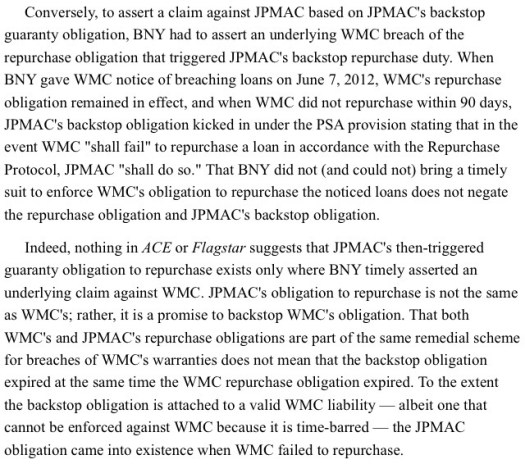 The First Department, however, declined to dismiss the backstop repurchase claims against JPMC. Although the underlying remedy against WMC was time-barred, the Court held that the Bank of NY could still try to make JPMC to repurchase the loans because JPMC’s guaranty obligation did not accrue until after WMC failed to buy back the loans within 90 days after the Bank of NY’s notice of the material breach.