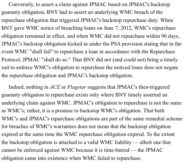 The First Department, however, declined to dismiss the backstop repurchase claims against JPMC. Although the underlying remedy against WMC was time-barred, the Court held that the Bank of NY could still try to make JPMC to repurchase the loans because JPMC’s guaranty obligation did not accrue until after WMC failed to buy back the loans within 90 days after the Bank of NY’s notice of the material breach.