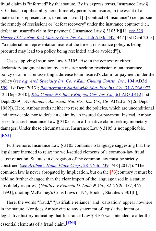 In Ambac Assur. Corp. v Countrywide Home Loans, Inc., however, an insurer sought to take the operation of section 3105 beyond voiding a falsely procured policy. Ambac, a financial guaranty insurer, brought an action against Countrywide to hold it liable for falsely inducing Ambac to irrevocably guarantee 17 residential mortgage-backed securitizations. On summary judgment, Ambac argued that Insurance Law § 3105 dispensed with the common-law requirement of proving justifiable reliance and loss causation to succeed on its fraudulent inducement claim.