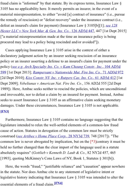 The First Department rejected Ambac’s argument that section 3105 should be extended to reduce its burden on an affirmative damages claim for common-law fraud. The Court held: