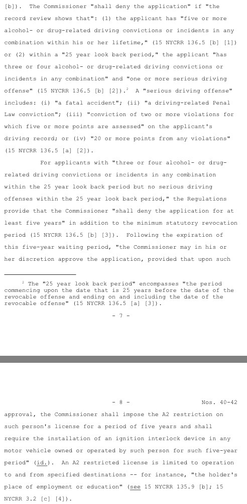 So, because Carney had six convictions, he was permanently barred from getting a license under section 136.5(b)(1). Matsen was also permanently barred under section 136.5(b)(2) because she had three DWIs and a serious driving offense (the two speeding violations). And Acevedo was denied for an additional five-year period under section 136.5(b)(3). They challenged the denials, arguing that the DMV regulations exceeded the agency’s authority and impermissibly stepped on the toes of the legislative process, that the regulations conflicted with the Vehicle and Traffic Law, and that they were improperly applied retroactively.