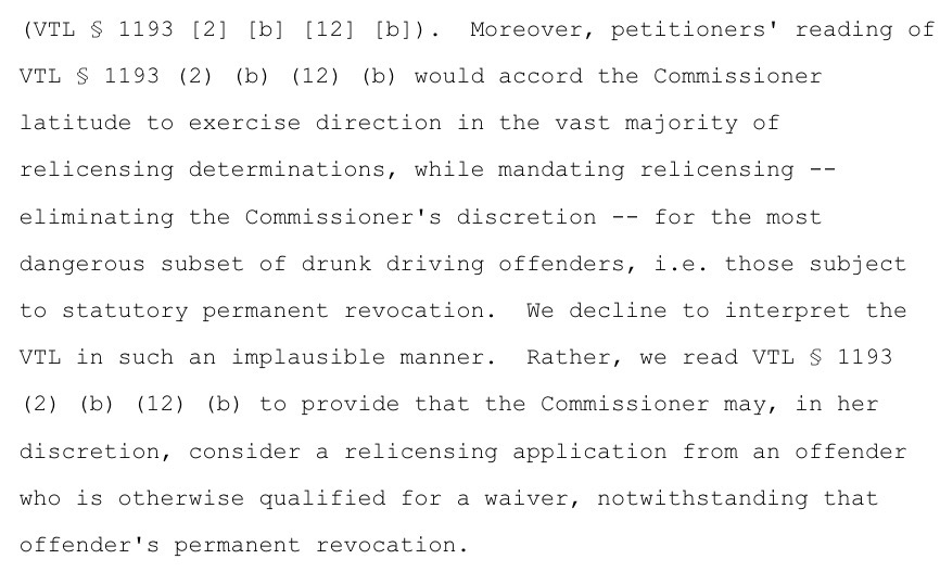 The Court of Appeals first rejected the petitioners’ premise that the VTL somehow entitled them to get their licenses back after their revocation periods ended. Not so, the Court held. The VTL only specifies a minimum revocation period after a DWI offense and affords the DMV Commissioner extensive discretion to determine relicensure applications after that. Particularly, the Court noted,
