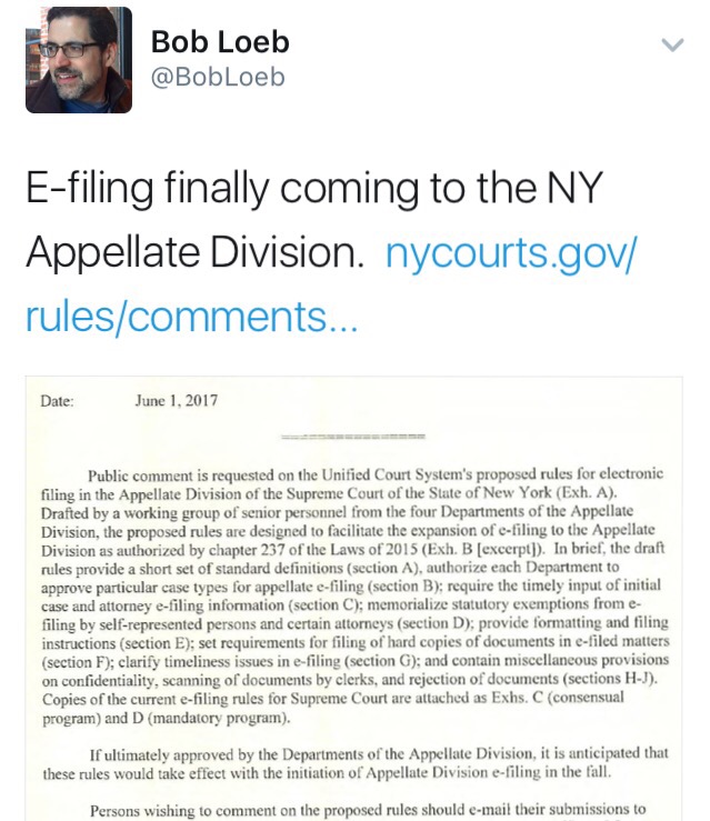 As Bob Loeb of Orrick, Herrington & Sutcliffe’s appellate group pointed out yesterday, the New York courts have issued a proposed rule amendment that would finally bring e-filing to the Appellate Division.
