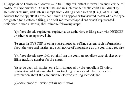 So, what would be different if e-filing finally makes its way to the Appellate Division? First, once a notice of appeal is entered with the County Clerk and sent to the Appellate Division, the appealing party would be required to file electronically a notice of appearance of sorts, and provide notice to the other parties that the appeal will be e-filed.