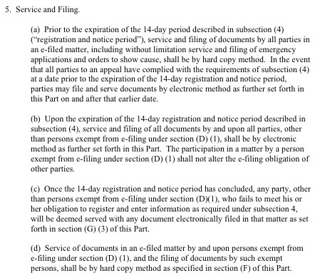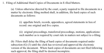 Second, e-filing briefs and the record would not dispense with the requirement to file hard copies with the Court, though it would reduce the number of copies that would have to be filed and dispense with service of hard copies altogether. Slightly less printing costs, but not yet eliminated totally. Baby steps in the right direction.