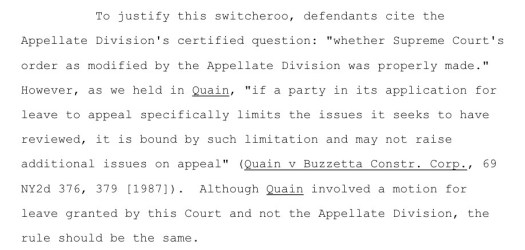 Interestingly, however, Judge Rowan Wilson dissented, and argued that the Court should have dismissed the appeal for lack of appellate jurisdiction because the two personal jurisdiction issues on which leave to appeal had been granted were rendered academic by an amendment to the complaint. The issues decided by the majority, Judge Wilson noted, were never argued in seeking leave to appeal, and the Court’s precedent typically binds the party seeking leave to appeal to those questions that were the basis of the leave grant. Judge Wilson did not take kindly to the defendants’ “switcheroo.”