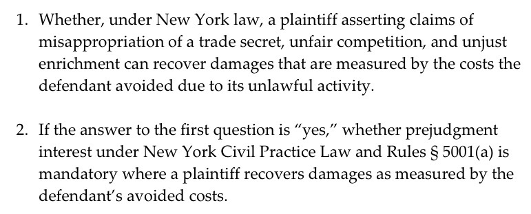On appeal, the Second Circuit held that finding liability was easy, but the question of the proper amount of damages for the misappropriation was less so. The Court explained that New York decisions appear to have authorized a number of different measures of damages in misappropriation of trade secrets cases, but never explicitly the costs avoided measure used by the disctrict court below. So, the Second Circuit decided to certify the question to the Court of Appeals to decide.