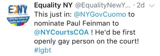 On Thursday, Governor Andrew Cuomo announced his nomination to fill the Court of Appeals seat left vacant by the tragic death of Associate Judge Shelia Abdus-Salaam. His pick: First Department Judge Paul G. Feinman, who not only brings more than 20 years of experience on the trial and appellate bench to the Court—a welcome addition—but who also will be the Court’s first openly gay judge. Here’s Judge Feinman’s bio: