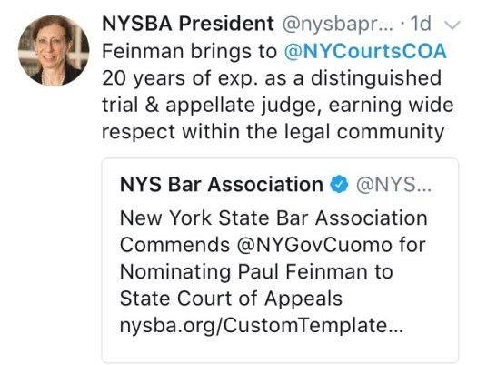 Judge Feinman is only 57 years old, so he should be able to serve 13 years of his 14-year term, until the New York Constitution’s mandatory retirement provision forces him off the Court at the end of 2030. Barring anything else unforeseen, the next nomination to the Court of Appeals won’t come until 2022, with the mandatory retirement of Judge Eugene Fahey. After the frequent judicial turnover at the Court over the last few years, having five years without any changes on the bench will be most welcome.