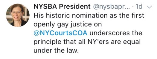 Needless to say, this is a momentous pick for the Governor, who has now also appointed the first African-American female judge (Shelia Abdus-Salaam) and the first Latino male judge (Michael Garcia) to the Court. Congratulations for the pick rolled in quickly, including from the New York State Bar Association and the LGBT Bar Association of Greater New York, among others.