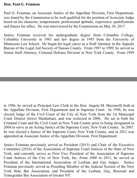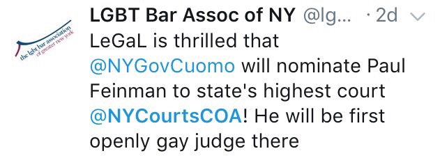 On Thursday, Governor Andrew Cuomo announced his nomination to fill the Court of Appeals seat left vacant by the tragic death of Associate Judge Shelia Abdus-Salaam. His pick: First Department Judge Paul G. Feinman, who not only brings more than 20 years of experience on the trial and appellate bench to the Court—a welcome addition—but who also will be the Court’s first openly gay judge. Here’s Judge Feinman’s bio: