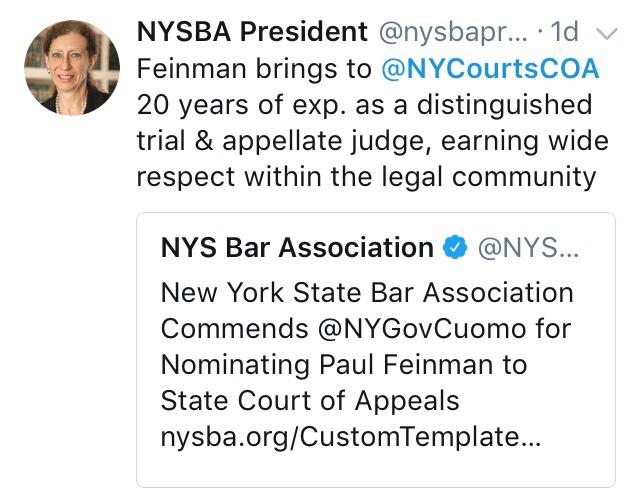 The next step in Judge Feinman’s nomination is a confirmation hearing before the Sebate. The Senate typically has 30 days to hold the hearing, but they are currently scheduled to end the legislative session and leave Albany this Wednesday, June 21st. That leaves an incredibly short window for the Senate to schedule and hold a confirmation hearing. But, after being so wrong about just how quickly this nomination process could go, I know now not to question whether it will get done in time before the end of the June legislative session. So, there you have it, from Judge Abdus-Salaam’s death in early April to a new Court of Appeals Judge at the end of June.