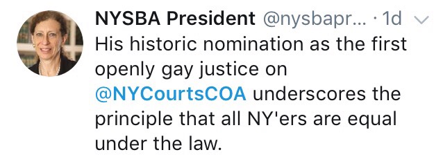 Needless to say, this is a momentous pick for the Governor, who has now also appointed the first African-American female judge (Shelia Abdus-Salaam) and the first Latino male judge (Michael Garcia) to the Court. Congratulations for the pick rolled in quickly, including from the New York State Bar Association and the LGBT Bar Association of Greater New York, among others.