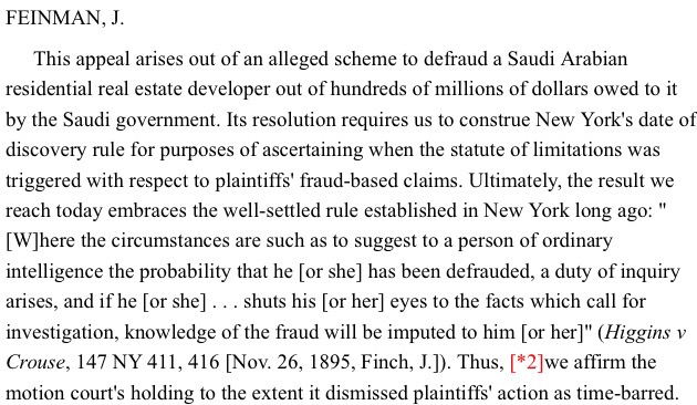 Having sat on the First Department for the past five years, Judge Feinman’s extensive experience resolving commercial cases will be an asset to the Court. For example, in what should be Judge Feinman’s last opinion on the First Department, he dismissed a case alleging a scheme to defraud a Saudi Arabian residential real estate developer out of hundreds of millions of dollars owed to it by the Saudi government as time-barred under New York’s date of discovery rule for fraud claims (see MBI Intl. Holdings Inc. v Barclays Bank, PLC, 2017 NY Slip Op 04381 [1st Dept June 1, 2017]). In doing so, Judge Feinman reaffirmed the nearly 125-year-old rule that a person who thinks he or she may have been defrauded has a duty to inquire, and failure to do so when the fraud could have been reasonably ascertained may leave the claims time-barred if not brought within 2 years thereafter.
