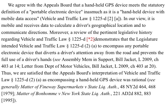 The Appellate Division, Third Department held that the DMV’s interpretation of the statute to criminalize the use of a handheld GPS while driving was rational. The Court reasoned that the GPS fit within the statutory definition of a “portable electronic device” because “it is mobile and receives data to calculate a driver’s geographical location and to communicate directions” (Opn, at *1). The Court’s review of the legislative history underlying the statute confirmed that the Legislature meant to prohibit broadly the use of any mobile device that distracts a driver’s attention from the road and prevents the use of both hands while driving.