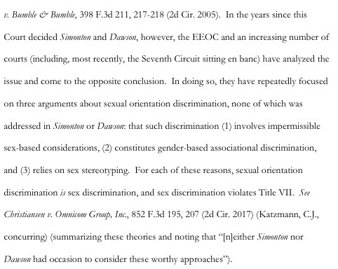 Finally, the EEOC argues that the Second Circuit’s current distinction between impermissible gender stereotyping and lawful sexual orientation discrimination is unworkable and leads to absurd results. Numerous courts have found that the fine line drawn by the Court in Simonton just simply doesn’t exist. For example, the EEOC points out, the Second Circuit’s precedent “leads to the absurd result that only those gay men who act ‘stereotypically feminine’ and those lesbians who act stereotypically masculine are entitled to protection from discrimination” (Brf, at 21). This can’t be. Indeed, the Second Circuit’s ruling in Simonton would allow a gay employee to be fired for exercising rights the Supreme Court found protected in Obergefell v Hodges (135 S Ct 2584 [2015]) by marrying his spouse. Simonton, therefore, should be overruled, the EEOC argues.