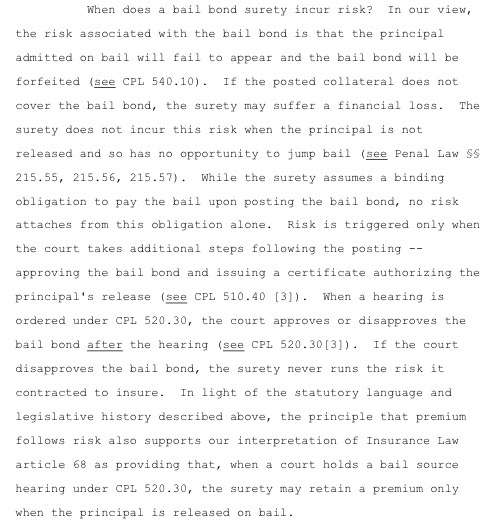 The Court also held that “[t]he insurance law principle that premium follows risk further supports this result” (Opn, at 10). The Court noted that in the insurance context, a premium is generally understood as “consideration paid to an insurer for assuming a risk” (id. at 11). Because there is no risk to the bail bondsman unless the trial court actually accepts the bond and the criminal defendant is released, the bondsman then can’t have earned the premium unless that happens.
