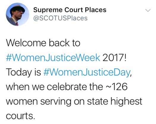 If you haven’t followed the hashtags #WomenJusticeWeek and #WomenJusticeDay on Twitter, you really should. For this past week, Jack Metzler (@SCOTUSPlaces) and the other #AppellateTwitter denizens have been paying tribute to the distinguished women Justices of the Supreme Court and the approximately 125 women Justices of the State high courts.