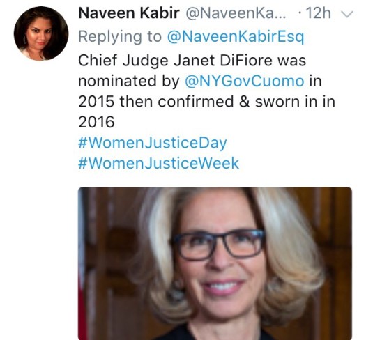 Included in that celebration are the three current women Judges of the Court of Appeals: Chief Judge Janet DiFiore, Associate Judge Jenny Rivera, and Associate Judge Leslie Stein, which were well covered by Naveen Kabir (@NaveenKabirEsq) in this thread: