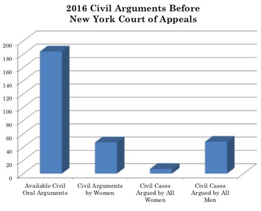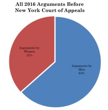 Women argued in the New York Court of Appeals, on the other hand, approximately 37% of the time (136 arguments by women attorneys out of 372 opportunities). That’s a significantly better rate than in the federal Courts of Appeals (assuming the Fifth Circuit is a good example) and in the Supreme Court. Of the cases that were argued before the Court of Appeals in 2016, there were 31 cases in which two women attorneys argued compared to 74 cases in which two men faced off.