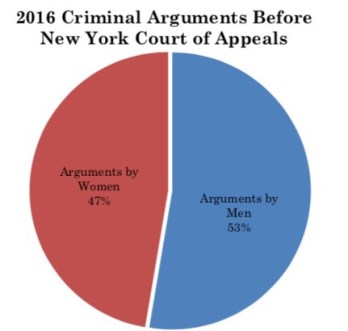 In 2016, there were 188 attorneys who argued before the Court of Appeals in criminal cases. 89 of those attorneys were women. That’s 47%. The number of criminal cases in which both advocates were women was also largely equal to the number where both were men, 24 to 26.