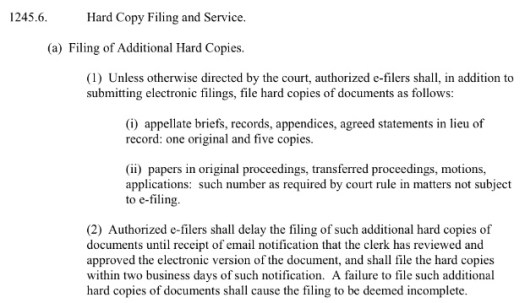The new Appellate Division e-filing rules don’t entirely eliminate the need to file hard copies of your brief and record with the Court. But the total number has been reduced to an original and five copies. So, some paper will be saved, but not a ton.