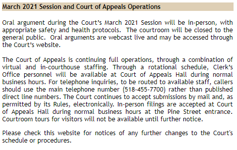 While the Court of Appeals returns to in-person arguments this month, the Appellate Division departments have so far continued their plan to conduct virtual arguments via Microsoft Teams, at least for the next few months. The First Department, for example, announced yesterday that it would remain with virtual arguments for the March and April terms, but would return to in-person arguments on Wednesdays during the May and June terms, with the remaining arguments on Tuesdays, Thursdays, and Fridays, if necessary, being conducted virtually. If NY’s COVID cases continue to decline, as we all hope they will, a return to fully in-person arguments in the Appellate Division can’t be too far behind.