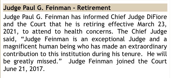 In an entirely unexpected announcement this afternoon, Tuesday, March 23, 2021, just before the Court of Appeals was about to take the bench for its first in-person arguments of 2021, Associate Judge Paul Feinman announced that he was retiring from the bench effective immediately, citing health reasons. Obviously, our first thoughts are of his well-being and I certainly wish Judge Feinman the best in his retirement.