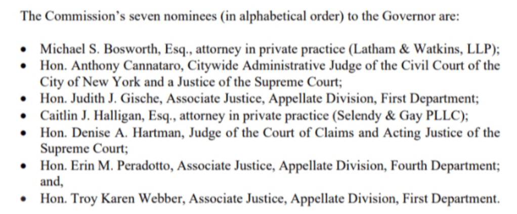 Late last week, the Commission released the list of seven candidates from which Governor Cuomo can select the nominee to fill Judge Feinman’s vacancy.