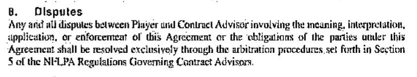 Revis’s only written agreement with Schwartz, however, was the NFLPA standard representation agreement, which is a preprinted form that contains a fairly broad arbitration clause sending all disputes arising under the agreement to arbitration.
