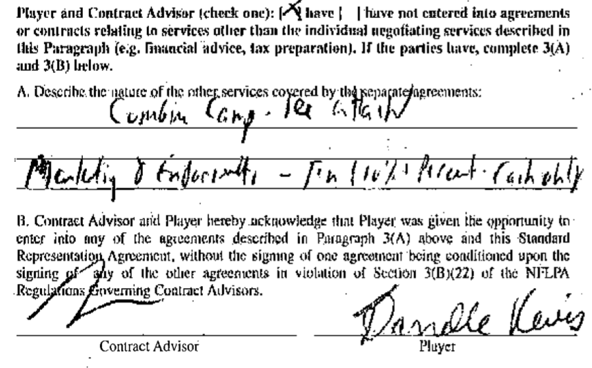 At the time he signed the SRA, Revis also orally agreed that Schwartz would represent him in negotiating off the field endorsement deals in exchange for a 10% contingency fee. The SRA notes that Revis and Schwartz had entered that separate agreement for legal services at the same time as the SRA.
