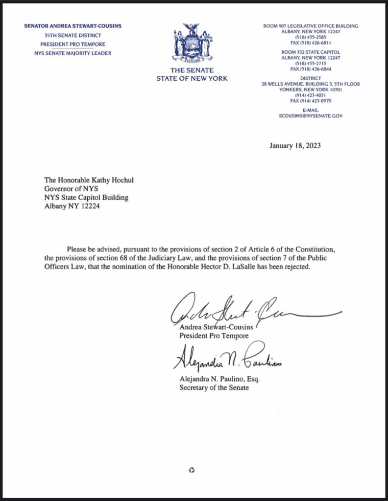 Following the conclusion of the hearing, Senate Majority Leader Andrea Stewart-Cousins disregarded the Governor’s arguments for a full floor vote and sent Governor Hochul the official notice that the Senate had rejected Justice LaSalle’s nomination.